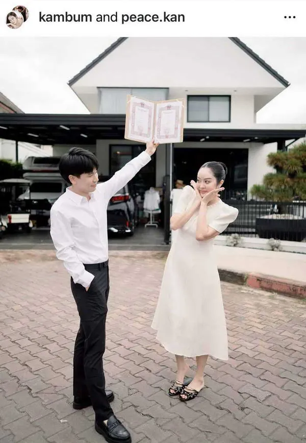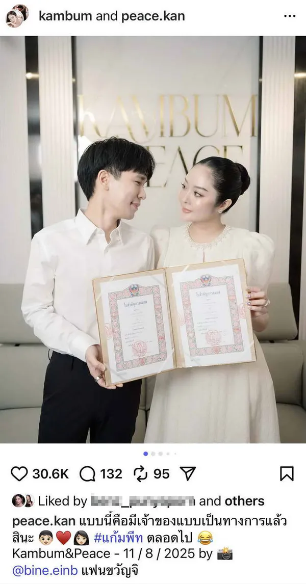 และล่าสุดทั้งคู่ได้เดินหน้าชีวิตคู่กันไปอีกสเต็ปแล้ว ด้วยการจดทะเบียนสมรสอย่างถูกต้องตามกฏหมาย โดยได้โพสต์โชว์ลงอินสตาแกรมส่วนตัว พร้อมข้อความว่า "แบบนี้คือมีเจ้าของแบบเป็นทางการแล้วสินะ #แก้มพีท ตลอดไป Kambum&Peace - 11 / 8 / 2025 "