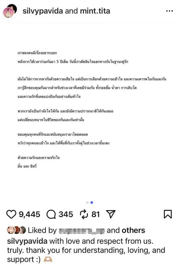 พวกเรายังเป็นกำลังใจให้กัน และยังมีความปรารถนาดีให้กันเสมอ แค่เปลี่ยนบทบาทในชีวิตของกันและกันเท่านั้น ขอบคุณทุกคนที่รักและสนับสนุนเรามาโดยตลอด หวังว่าทุกคนจะเข้าใจ และให้พื้นที่กับเราทั้งคู่ในช่วงเวลานี้นะคะ ด้วยความรักและความจริงใจ มิ้น และ ซิลวี่"