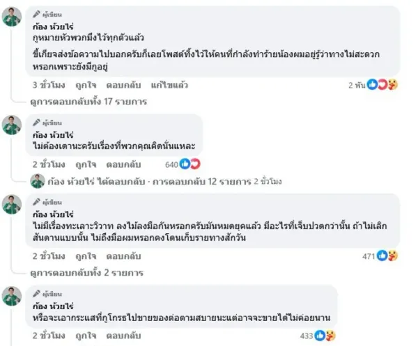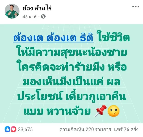 กลายเป็นประเด็นที่หลายคนกำลังให้ความสนใจอย่างมาก หลังเห็นโพสต์สุดเดือดของ "ก้อง ห้วยไร่" ที่ล่าสุดเจ้าตัวได้โพสต์ข้อความว่า "ต้องเต ต้องเต ธิติ ใช้ชีวิตให้มีความสุขนะน้องชาย ใครคิดจะทำร้ายมึง หรือมองเห็นมึงเป็นแค่ ผลประโยชน์ เดี๋ยวกูเอาคืนแบบ หวานจ้วย" และหลังจากนั้นก็ได้โพสต์ข้อความต่อแบบรัวๆ เช่น "กูหมายหัวพวกมึงไว้ทุกตัวแล้ว ขี้เกียจส่งข้อความไปบอกครับก็เลยโพสต์ทิ้งไว้ให้คนที่กำลังทำร้ายน้องผมอยู่รู้ว่าทางไม่สะดวกหรอกเพราะยังมีกูอยู่" , "ไม่ต้องเดานะครับเรื่องที่พวกคุณคิดนั่นแหละ", "ไม่มีเรื่องทะเลาะวิวาท ลงไม้ลงมือกันหรอกครับมันหมดยุคแล้ว มีอะไรที่เจ็บปวดกว่านั้น ถ้าไม่เลิกสันดานแบบนั้น ไม่ถึงมือผมหรอกคงโดนเก็บรายทางสักวัน" , "หรือจะเอากระแสที่กูโกรธไปขายของต่อตามสบายนะแต่อาจจะขายได้ไม่ค่อยนาน"