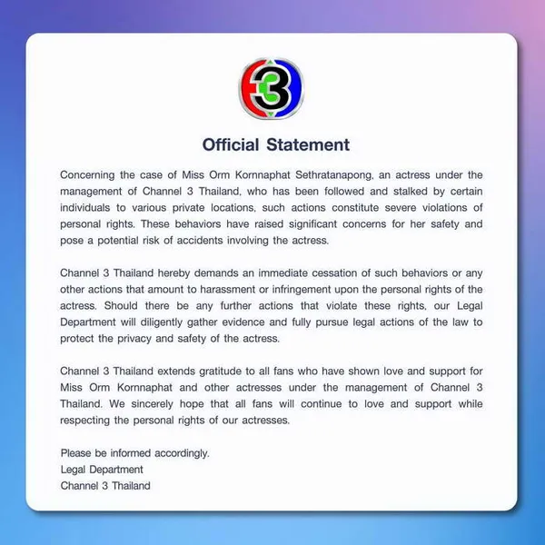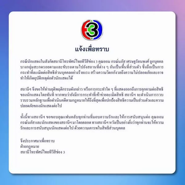 ไม่ได้นิ่งนอนใจ! ช่อง 3 ต้นสังกัดของ ออม กรณ์นภัส ออกแถลงการณ์ชี้แจงชี้แจงด่วน ปมดราม่าแฟนไซน์ที่เมืองจีน บริษัทผู้จัดงานไม่ได้ปฏิบัติตามข้อตกลงในสัญญา ทำนักแสดงสาวและคุณแม่สุดกลั้น ต้องหลั่งน้ำตากลางงาน เตรียมสอบข้อเท็จจริงทั้งหมดทันที