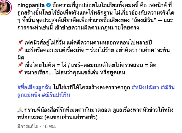 #ชื่อเสียงลูกฉัน ไม่ใช่เวทีให้ใครสร้างละครราคาถูก #หนิงปณิตา #ณิรินลูกแม่หนิง #ณิรินปณิริน กราบพี่น้องสื่อที่รักที่เมตตากันมาตลอด ดูแลเรื่องพาดหัวข่าวให้หนิงหน่อยนะคะ (คนชอบอ่านแค่พาดหัว)"