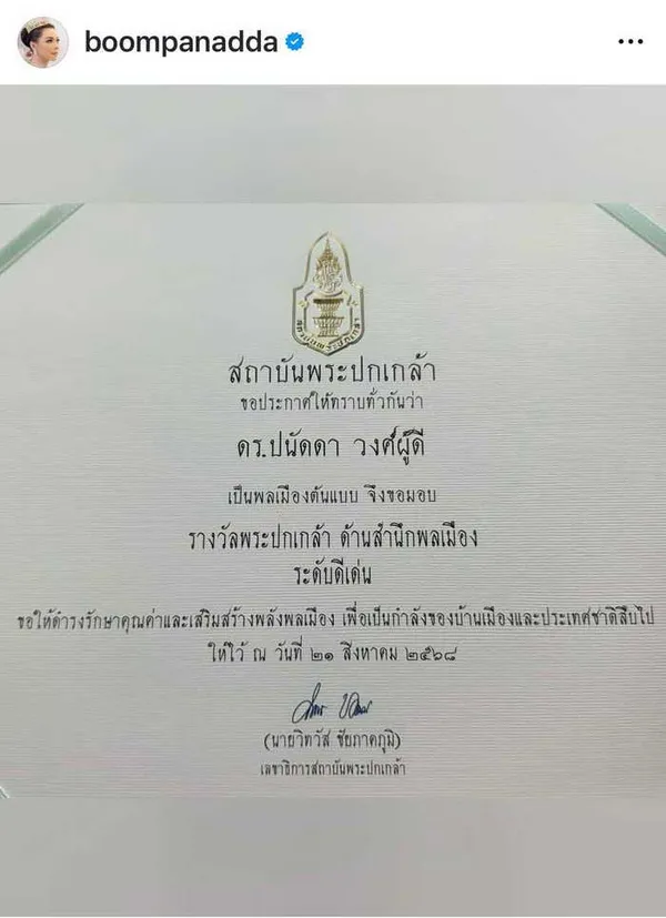 สุดปลื้ม! นางงามจิตอาสา บุ๋ม ปนัดดา วงศ์ผู้ดี ประธาน มูลนิธิองค์กรทำดี โพสต์อวดรางวัลแห่งความภูมิใจ หลังได้รับคิดเลือกให้ได้รับรางวัล พระปกเกล้า สำนึกพลเมือง ระดับดีเด่น ชาวเน็ตร่วมแสดงความยินดี