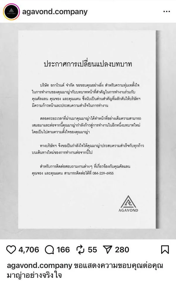 ทางบริษัทฯ จึงขอเป็นกำลังใจให้คุณมาญ่าประสบความสำเร็จกับทุกกับทุกก้าวบนเส้นทางใหม่ของการทำงานต่อจากนี้ไป สำหรับการติดต่อสอบถามงานต่างๆ ที่เกี่ยวข้องกับคุณคุณคัลแลน คุณจอง และคุณแดน สามารถติดต่อได้ที่ 084-229-6955"