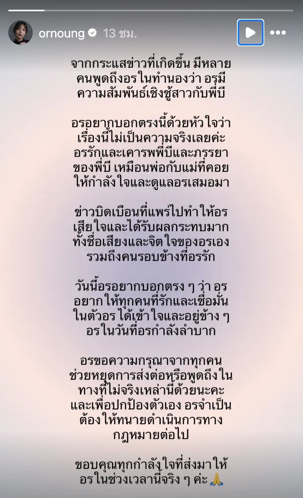 ทำเอาหลายคนจับตาความสัมพันธ์สำหรับ "อรอุ๋ง BNK" หรือ "อร พัศชนันท์ เจียจิรโชติ" ที่ตกเป็นข่าวพัวพันกับ "หมอบี ทูตสื่อวิญญาณ" ในเวลานี้ ซึ่งเธอเองได้ออกมาชี้แจงความบริสุทธิ์ใจผ่านอินสตาแกรม พร้อมทั้งยังบอกนับถือหมอบีและภรรยาเหมือนกับเป็นพ่อและแม่ โดยมีเนื้อความในจดหมายว่า "จากกระแสข่าวที่เกิดขึ้น มีคนพูดถึง "อร" ในทำนองว่า อรมีความสัมพันธ์เชิงชู้สาวกับพี่บี อรอยากบอกตรงนี้ด้วยหัวใจว่า เรื่องนี้ไม่เป็นความจริงเลยค่ะ อรรักและเคารพพี่บีและภรรยาของพี่บี เหมือนพ่อกับแม่ที่ให้กำลังใจและดูแลอรเสมอมาข่าวบิดเบือนที่แพร่ไป ทำให้อรเสียใจและได้รับผลกระทบมาก ทั้งชื่อเสียงและจิตใจของอรเอง รวมถึงคนรอบข้างที่อรรัก วันนี้อรอยากบอกตรง ๆ ว่า อรอยากให้ทุกคนที่รักและเชื่อมั่นในตัวอรได้เข้าใจและอยู่ข้าง ๆ อร ในวันที่อรกำลังลำบาก อรขอความกรุณาจากทุกคน ช่วยหยุดการส่งต่อหรือพูดในทางที่ไม่จริงเหล่านี้ด้วยนะคะ และเพื่อปกป้องตัวเอง อรจำเป็นต้องให้ทนายดำเนินการทางกฎหมายต่อไป ขอบคุณทุกกำลังใจที่ส่งมาให้อรในช่วงเวลานี้จริง ๆ ค่ะ"
