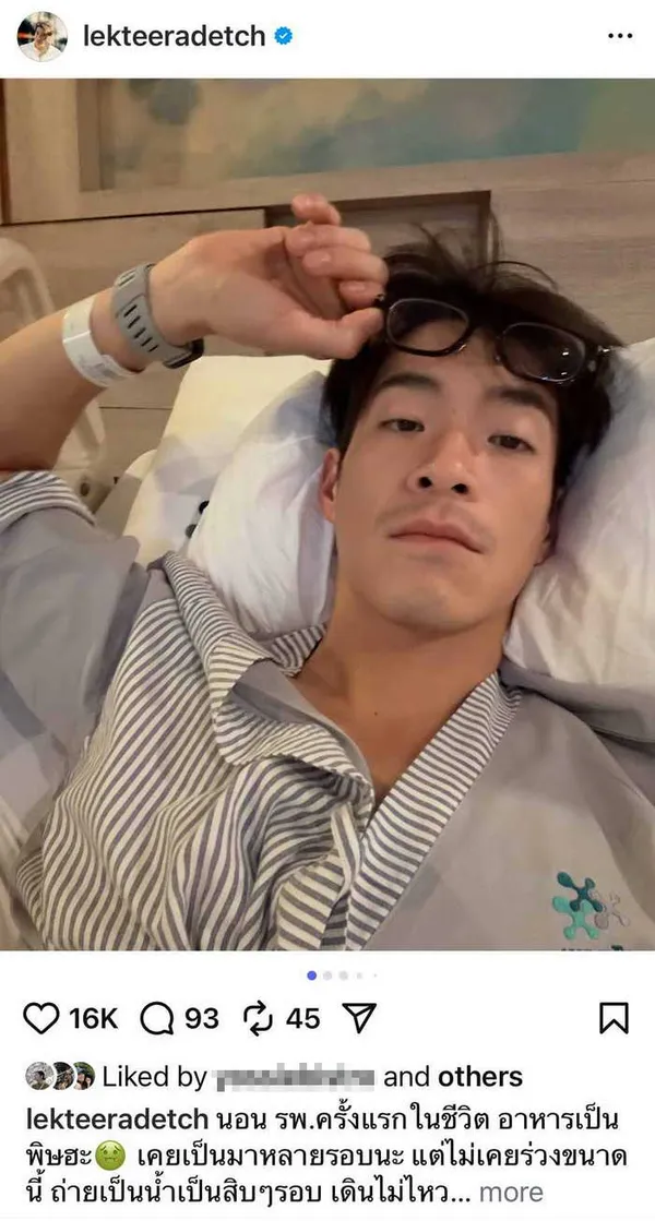 "นอน รพ.ครั้งแรกในชีวิต อาหารเป็นพิษฮะ เคยเป็นมาหลายรอบนะ แต่ไม่เคยร่วงขนาดนี้ ถ่ายเป็นน้ำเป็นสิบๆรอบ เดินไม่ไหว ตาพร่า มองอะไรไม่ชัด โฟกัสไม่ได้ ตอนแรกคิดว่าแค่ไปหาหมอ เอายา กลับบ้าน แต่หมอบอก ”แอดมิทนะ" 555