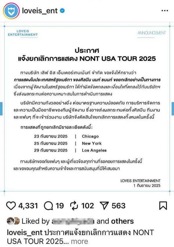 เลิฟ อิส เอ็นเตอร์เทนเม้นท์ ออกประกาศแจ้งยกเลิกทัวร์คอนเสิร์ต "NONT USA TOUR 2025" ใน 3 เมืองใหญ่ที่ประเทศสหรัฐอเมริกา เนื่องจากทีมผู้จัดงานทำผิดเงื่อนไขข้อตกลง ทำให้เกิดความกังวลเรื่องความปลอดภัยของศิลปิน และทีมงาน