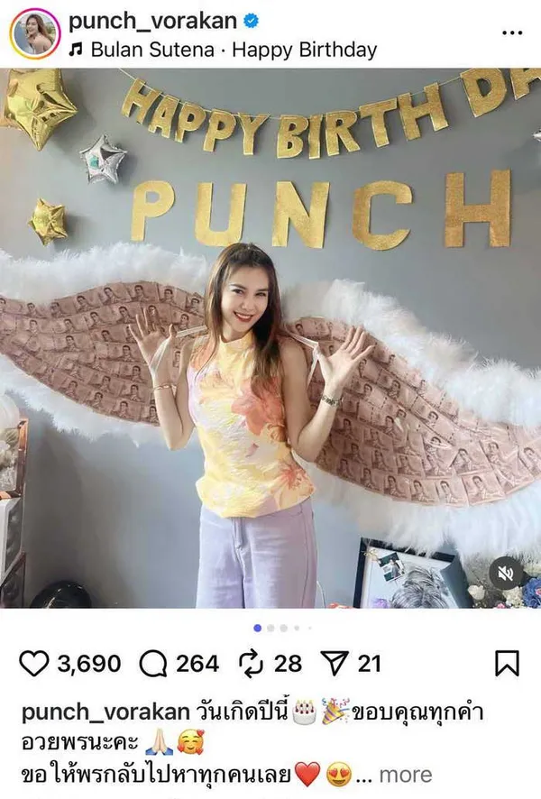 และสาว พั้นช์ วรกาญจน์ ก็ได้โพสต์ภาพบรรยากาศบางส่วนลงอินสตาแกรมส่วนตัว พร้อมข้อความขอบคุณแฟนๆว่า "วันเกิดปีนี้ ขอบคุณทุกคำอวยพรนะคะ ขอให้พรกลับไปหาทุกคนเลย"