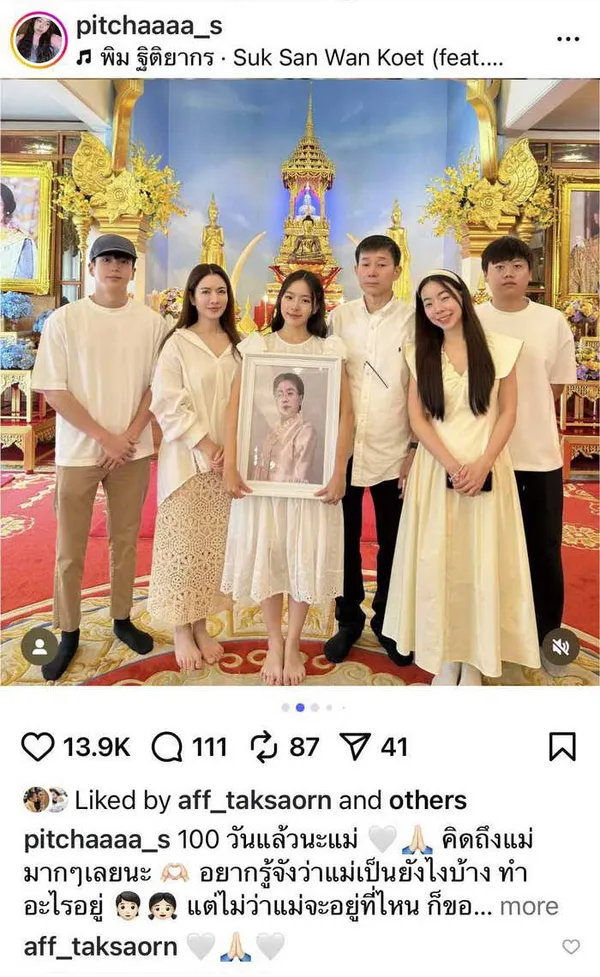 ล่าสุดทางครอบครัวได้จัดพิธีทำบุญอุทิสส่วนกุศลให้กับ คุณแม่เพ็กแฮ ในโอกาสครอบรอบ 100 วันของการจากไป โดยที่น้องสาวคนเล็กของบ้าน นุ่น พิชชาธร ได้โพสต์ภาพบรรยากาศบางส่วนให้ได้ชมกัน พร้อมข้อความระบุว่า
