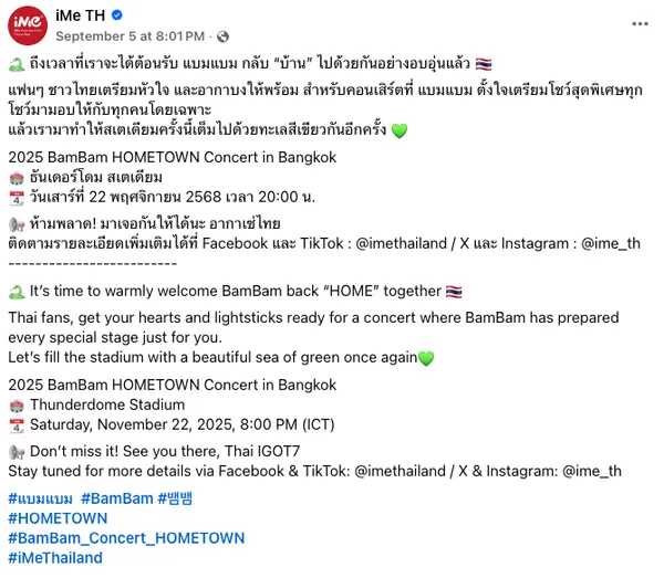 “ถึงเวลาที่เราจะได้ต้อนรับ แบมแบม กลับ “บ้าน” ไปด้วยกันอย่างอบอุ่นแล้ว แฟนๆ ชาวไทยเตรียมหัวใจ และอากาบงให้พร้อม สำหรับคอนเสิร์ตที่ แบมแบม ตั้งใจเตรียมโชว์สุดพิเศษทุกโชว์มามอบให้กับทุกคนโดยเฉพาะ แล้วเรามาทำให้สเตเดียมครั้งนี้เต็มไปด้วยทะเลสีเขียวกันอีกครั้ง 2025 BamBam HOMETOWN Concert in Bangkok ธันเดอร์โดม สเตเดียม วันเสาร์ที่ 22 พฤศจิกายน 2568 เวลา 20:00 น. ห้ามพลาด! มาเจอกันให้ได้นะ อากาเซ่ไทย ติดตามรายละเอียดเพิ่มเติมได้ที่ Facebook และ TikTok : @imethailand / X และ Instagram : @ime_th” เรียกว่างานนี้แฟนชาวไทยจะต้องไม่พลาดเตรียมกดบัตรและไปร่วมสนุกกันในงาน หากมีความคืบหน้าของคอนเสิร์ตครั้งนี้ไม่พลาดนำมาอัปเดตให้ได้ติดตามต่ออย่างแน่นอน