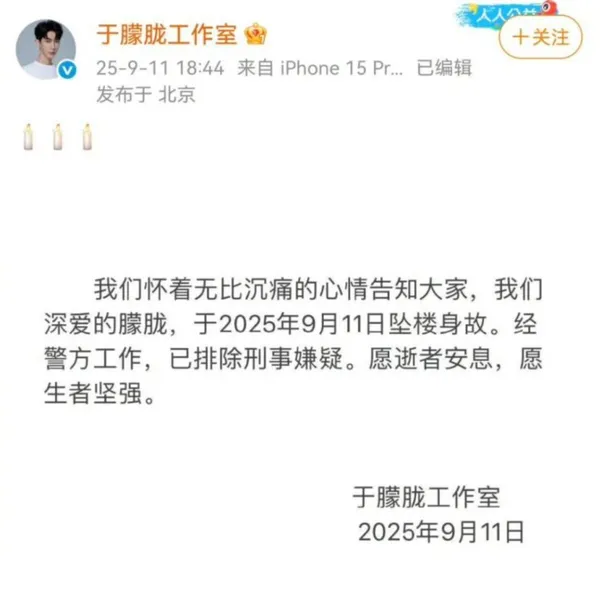 “เราขอแจ้งข่าวด้วยความโศกเศร้าอย่างสุดซึ้งว่า อวี่เมิ่งหลง ผู้เป็นที่รักของเรา ได้เสียชีวิตจากการพลัดตกจากอาคารเมื่อวันที่ 11 กันยายน 2025 หลังจากการสอบสวนของตำรวจ ได้มีการยืนยันว่าไม่มีความเกี่ยวข้องกับคดีอาชญากรรม ขอให้ผู้ล่วงลับไปสู่สุคติ และขอให้ผู้ที่ยังอยู่เข้มแข็งต่อไป” ทามกลางความโศกเศร้าของเหล่าแฟนคลับกับการเสียชีวิตครั้งนี้ ทาง TNN ขอแสดงความเสียใจมาในโอกาสนี้เช่นเดียวกัน