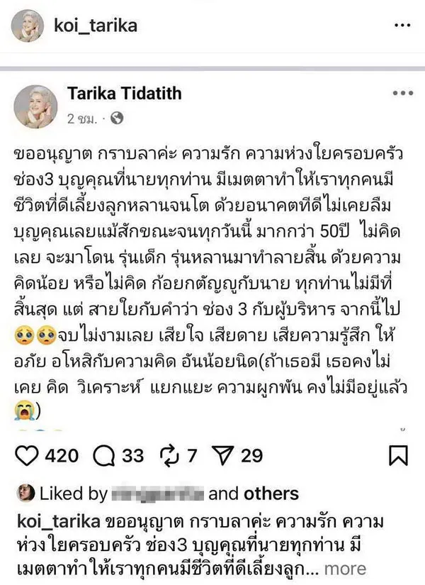 - เกิดอะไรขึ้น? ก้อย ทาริกา ผู้จัดชื่อดังโพสต์อำลาช่อง 3 เสียใจ จบไม่สวย!