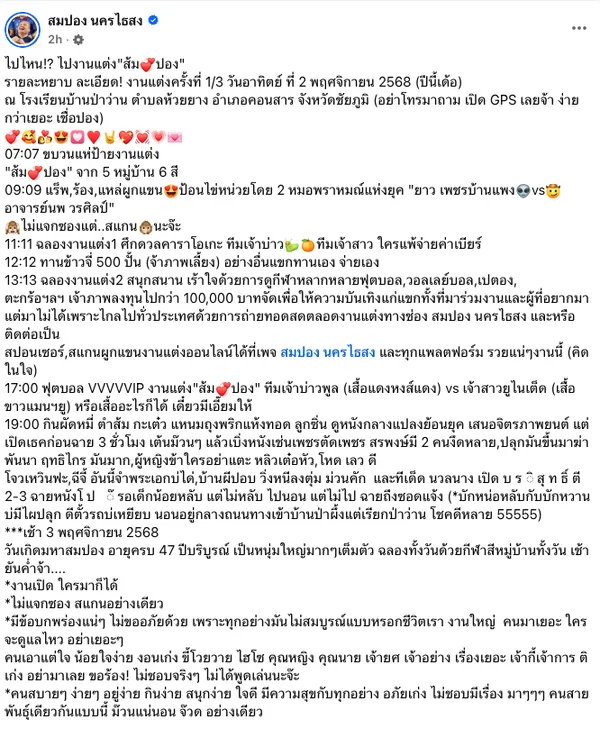 ทำเอาเซอร์ไพรส์อยู่ไม่น้อยสำหรับ “สมปอง นครไธสง” อดีตพระนักเทศน์และอินฟลูเอนเซอร์ดัง ที่ล่าสุดเจ้าตัวได้โพสต์ประกาศวันวิวาห์กับแฟนสาวนอกวงการ โดยเผยว่าในวันอาทิตย์ ที่ 2 พฤศจิกายน 68 ที่ โรงเรียนบ้านป่าว่าน อำเภอคอนสาร จังหวัดชัยภูมิ ซึ่งเขาเองได้เขียนแคปชั่นว่า "ไปไหน!? ไปงานแต่ง"ส้ม ปอง" รายละหยาบ ละเอียด! งานแต่งครั้งที่ 1/3 วันอาทิตย์ ที่ 2 พฤศจิกายน 2568 (ปีนี้เด้อ) ณ โรงเรียนบ้านป่าว่าน ตำบลห้วยยาง อำเภอคอนสาร จังหวัดชัยภูมิ (อย่าโทรมาถาม เปิด GPS เลยจ้า ง่ายกว่าเยอะ เชื่อปอง)