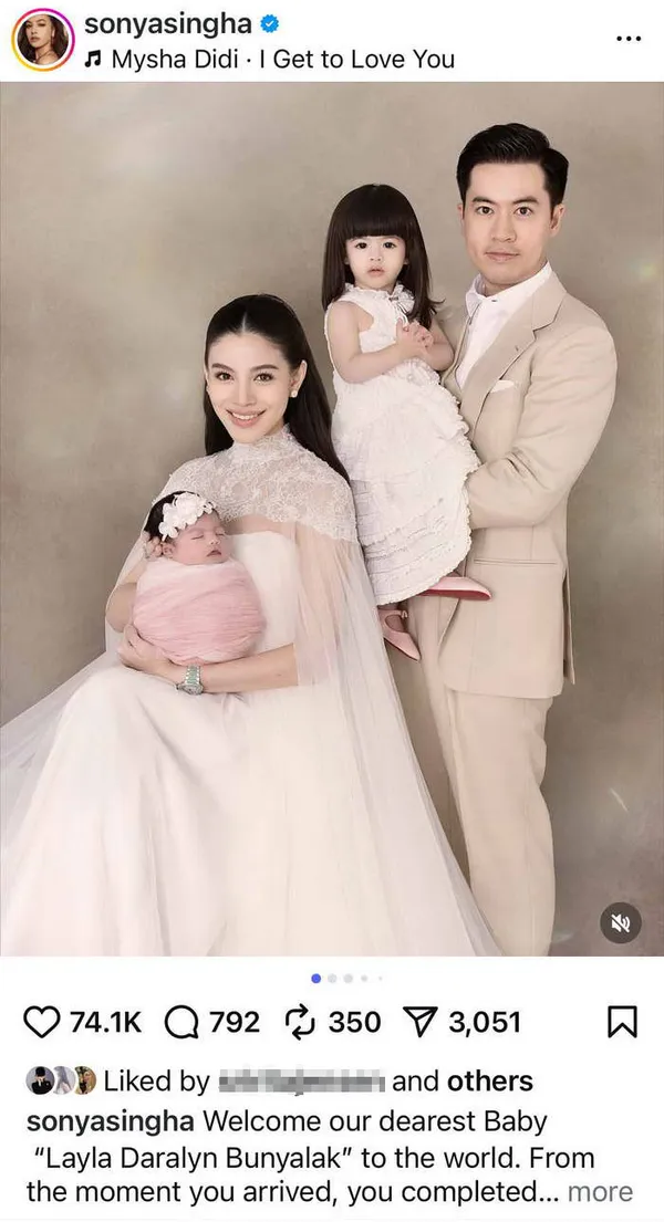โดยได้โพสต์ภาพเปิดตัวครั้งแรก พร้อมข้อความแนะนำตัวว่า "Welcome our dearest Baby "Layla Daralyn Bunyalak" to the world. From the moment you arrived, you completed our hearts in ways we never imagined. We love you endlessly our little angel, 05.09.2025
