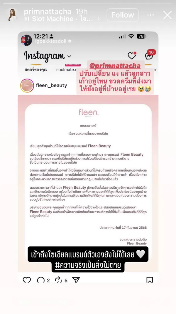 และนอกจากนี้ยังมีการรีโพสต์แถลงการณ์จากทางแบรนด์ Fleen Beauty พร้อมแคปชั่นว่า "เข้าถึงโซเชียลแบรนด์ตัวเองยังไม่ได้เลย #ความจริงเป็นสิ่งไม่ตาย"