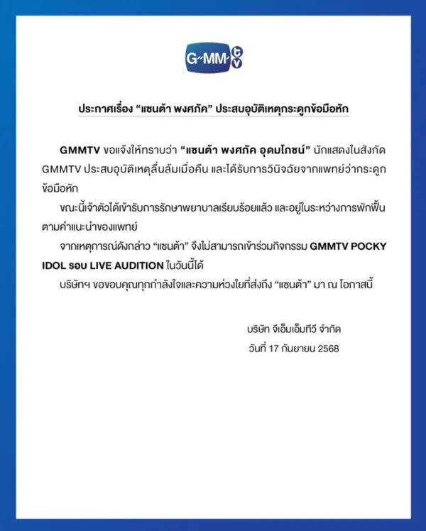 ทำเอาแฟนคลับอดเป็นห่วงไม่ได้สำหรับนักแสดงหนุ่ม “แซนต้า พงศภัค” ที่ล่าสุดประสบอุบัติเหตุกระดูกข้อมือหัก โดยทางต้นสังกัดได้ออกมาโพสต์ถึงกรณีนี้ว่า “GMMTV ขอแจ้งให้ทราบว่า "แซนต้า พงศภัค อุดมโภชน์" นักแสดงในสังกัด GMMTV ประสบอุบัติเหตุลื่นล้มเมื่อคืน และได้รับการวินิจฉัยจากแพทย์ว่ากระดูกข้อมือหัก ขณะนี้เจ้าตัวได้เข้ารับการรักษาพยาบาลเรียบร้อยแล้ว และอยู่ในระหว่างการพักฟื้นตามคำแนะนำของแพทย์ จากเหตุการณ์ดังกล่าว "แซนต้า" จึงไม่สามารถเข้าร่วมกิจกรรม GMMTV POCKY IDOL รอบ LIVE AUDITION ในวันนี้ได้ บริษัทฯ ขอขอบคุณทุกกำลังใจและความห่วงใยที่ส่งถึง "แซนต้า" มา ณ โอกาสนี่ บริษัท จีเอ็มเอ็มทีวี จำกัด วันที่ 17 กันยายน 2568”