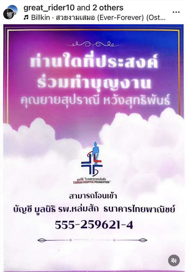 ผมขอใช้พื้นที่ตรงนี้สำหรับการบอกช่องทางทำบุญส่งคุณยายนะครับ ทางครอบครัวเราตกลงกันว่าจะนำเงินทั้งหมดเข้า "มูลนิธิโรงพยาบาลหล่มสัก" คือโรงพยาบาลที่บ้านเราเอง เพื่อช่วยเหลือผู้ป่วยท่านอื่นๆต่อไปครับ … สามารถโอนตรงเข้ามูลนิธิได้เลยครับ