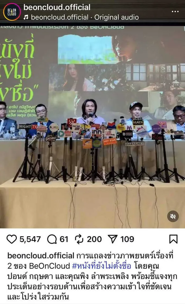 ล่าสุด ปอนด์ กฤษดา เจ้าของค่าย Be On Cloud พร้อมด้วย พิง ลำพระเพลิง ผู้กำกับภาพยนตร์ และทนายความ ได้ตั้งโต๊ะแถลงข่าวภาพยนตร์เรื่องที่ 2 ของ BeOnCloud #หนังที่ยังไม่ตั้งชื่อ เพื่อชี้แจงปมดราม่าดังกล่าว