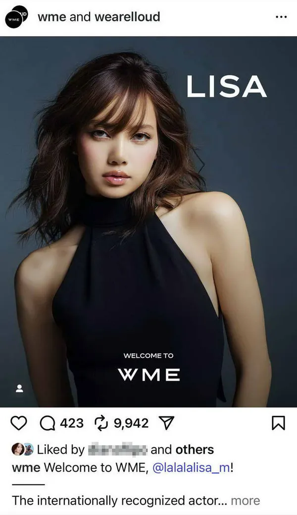 และล่าสุดทาง WME ได้โพสต์ข้อความต้อนรับ ลิซ่า พร้อมระบุข้อความแปลเป็นไทยว่า "ลลิษา มโนบาล นักแสดงชื่อดังระดับโลก ได้เซ็นสัญญากับ WME เพื่อเป็นตัวแทนในการแสดงของเธอ ขณะที่เธอยังคงเดินหน้าสร้างอาชีพในวงการภาพยนตร์และโทรทัศน์