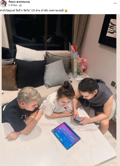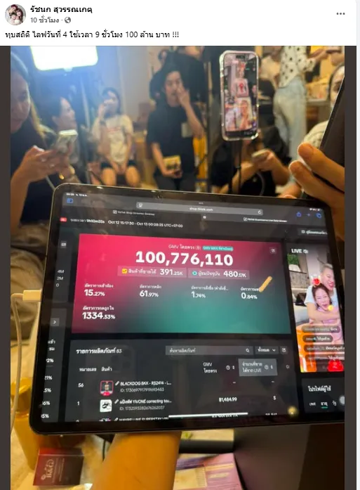เธอยังเผยอีกว่า ในช่วงหนึ่งของไลฟ์ สามารถทำยอดขายทะลุ 100 ล้านบาทภายใน 9 ชั่วโมง ซึ่งถือเป็นสถิติที่แทบไม่เคยเกิดขึ้นมาก่อนในวงการไลฟ์ขายของเมืองไทย โดยมี คนบันเทิงอินฟลูเอนเซอร์ แห่ร่วมไลฟ์แน่นบ้าน