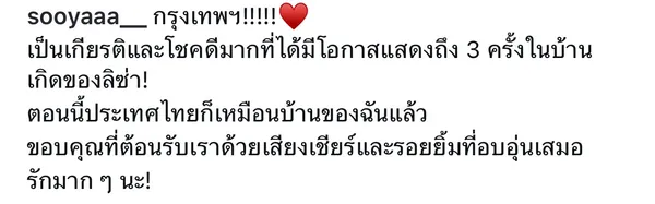 เรียกว่าได้ใจแฟนเพลงชาวไทยทั้งประเทศสำหรับ "จีซู" ที่ล่าสุดเธอได้โพสต์ภาพขณะที่ขึ้นโชว์ BLACKPINK WORLD TOUR IN BANGKOK ในไทยที่ราชมังคลากีฬาสถาน ในวันที่ 24–26 ตุลาคม 2568 ที่ผ่านมา ล่าสุดเธอได้โพสต์พร้อมข้อความว่า "กรุงเทพฯ!!!!! เป็นเกียรติและโชคดีมากที่ได้มีโอกาสแสดงถึง 3 ครั้งในบ้านเกิดของลิซ่า!ตอนนี้ประเทศไทยก็เหมือนบ้านของฉันแล้ว ขอบคุณที่ต้อนรับเราด้วยเสียงเชียร์และรอยยิ้มที่อบอุ่นเสมอ รักมาก ๆ นะ!"