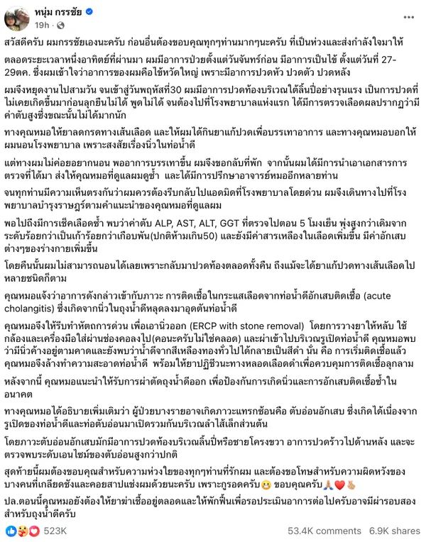 "สวัสดีครับ ผมกรรชัยเองนะครับ ก่อนอื่นต้องขอบคุณทุกๆท่านมากๆนะครับ ที่เป็นห่วงและส่งกำลังใจมาให้ ตลอดระยะเวลาหนึ่งอาทิตย์ที่ผ่านมา ผมมีอาการป่วยตั้งแต่วันจันทร์ก่อน มีอาการเป็นไข้ ตั้งแต่วันที่ 27-29ตค. ซึ่งผมเข้าใจว่าอาการของผมคือไข้หวัดใหญ่ เพราะมีอาการปวดหัว ปวดตัว ปวดหลัง