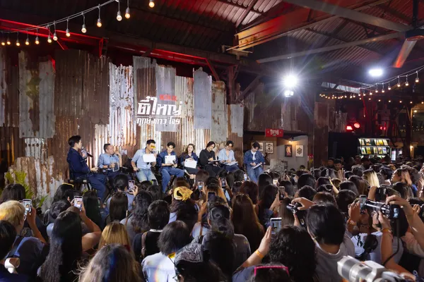 และแล้วโมเมนต์ที่ทุกคนรอคอยก็มาถึง เสียงปรบมือและเสียงเชียร์ดังสนั่นทั่วโกดังเมื่อเหล่านักแสดงทยอยปรากฏตัว นำโดย เฟย-ภัทร เอกแสงกุล, นนท์-ศดานนท์ ดุรงคเวโรจน์, โจ๊ก-อัครินทร์ อัครนิธิเมธรัฐ, เก้า-สุภัสสรา ธนชาต ตามด้วย โมสต์-วิศรุต หิมรัตน์ และ อาโป-ณัฐวิญญ์ วัฒนกิติพัฒน์ ที่ก้าวออกมาในลุคแจ็กเก็ตยีนส์และแว่นเลนส์เหลืองสุดเท่ กลายเป็นภาพจำที่จุดกระแส “ตี๋ใหญ่” ให้สะท้านทั้งเมือง โดยอาโปเผยถึงการมีส่วนร่วมออกแบบลุคนี้ด้วยตัวเอง เพื่อให้สะท้อนตัวตนของจอมโจรในตำนานได้อย่างสมจริง