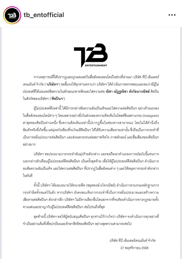 ล่าสุด บริษัท ทีบี เอ็นเตอร์เทนเม้นท์ จำกัด ต้นสังกัดของณิชา ออกแถลงการณ์อย่างเป็นทางการ ชี้แจงถึงกรณีที่เกิดขึ้น โดยระบุว่าได้ตรวจสอบพบการเผยแพร่ข้อความอันเป็นเท็จ และการใส่ความร้ายแรงต่อศิลปินในช่องทางออนไลน์หลายแห่ง โดยเฉพาะในส่วนความคิดเห็นของอินสตาแกรม ซึ่งผู้กระทำไม่ได้คำนึงถึงข้อเท็จจริง แต่มีเจตนาโจมตีให้ศิลปินได้รับความเสียหาย