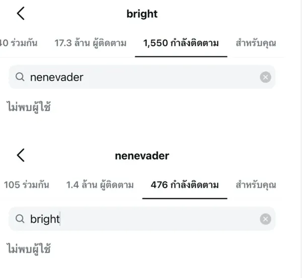 อย่างไรก็ตาม ช่วงหลังมานี้ไม่ค่อยมีโมเมนต์คู่ให้เห็นเท่าเดิม ก่อนที่ล่าสุดชาวเน็ตจะออกมาพูดเป็นเสียงเดียวกันว่า ทั้งไบร์ทและเนเน่ไม่ได้ติดตามไอจีกันแล้ว