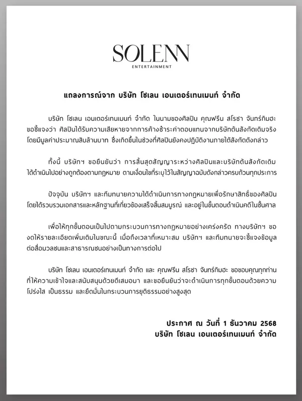 “ทางบริษัทฯ ของดให้รายละเอียดเพิ่มเติมในขณะนี้ เมื่อถึงเวลาที่เหมาะสม บริษัทฯ และทีมทนายจะชี้แจงข้อมูลต่อสื่อมวลชนและสาธารณชนอย่างเป็นทางการต่อไป บริษัท โชเลน เอนเตอร์เทนเมนท์ จำกัด และคุณฟรีน สโรชา จันทร์กิมฮะ ขอขอบคุณทุกท่านที่ให้ความเข้าใจและสนับสนุนด้วยดีเสมอมา และขอยืนยันว่าจะดำเนินการทุกขั้นตอนด้วยความโปร่งใส เป็นธรรม และยึดมั่นในกระบวนการยุติธรรมอย่างสูงสุด ประกาศ ณ วันที่ 1 ธันวาคม 2568 … บริษัท โซเลน เอนเตอร์เทนเมนท์ จำกัด”