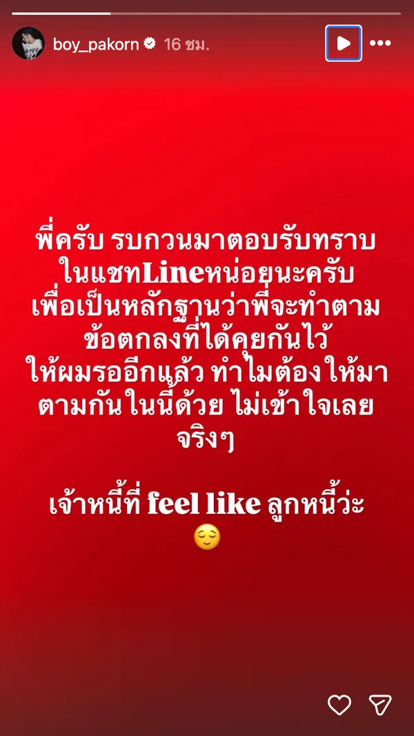เจ้าหนี้ที่ feel like ลูกหนี้! “บอย ปกรณ์” โพสต์ไอจีสตอรี่วอนลูกหนี้ทำตามข้อตกลง หลังจากเงียบหายไม่ตอบไลน์
