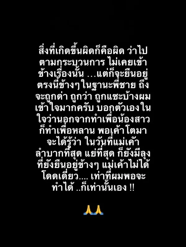 "สิ่งที่เกิดขึ้นผิดก็คือผิด ว่าไปตามกระบวนการ ไม่เคยเข้าข้างเรื่องนั้น แต่ก็จะยืนอยู่ตรงนี้ข้างๆ ในฐานะพี่ชาย ถึงจะถูกด่า ถูกว่า ถูกแซะบ้าง ผมเข้าใจมากครับ บอกตัวเองในใจว่านอกจากทำเพื่อน้องสาว ก็ทำเพื่อหลายพอเค้าโตมาจะได้รู้ว่า ในวันที่แม่เค้าลำบากที่สุด แย่ที่สุด ก็ยังมีลุงที่ยังยืนอยู่ข้างๆ แม่เค้าไม่ได้โดดเดี่ยว เท่าที่ผมพอจะทำได้ ก็เท่านั้นเอง" โดยหลังจากโพสต์ดังกล่าวถูกเผยแพร่ออกมาก็มีเพื่อนร่วมวงการ แฟนคลับ เข้ามาคอมเมนต์สุดกำลังใจเป็นจำนวนมาก หนึ่งในนั้นคือหนุ่ม "เวย์" ที่เข้ามาคอมเมนต์อีโมจิรูปหัวใจ