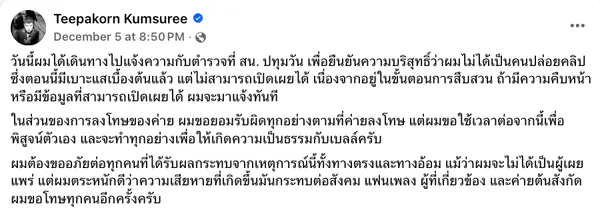 “วันนี้ผมได้เดินทางไปแจ้งความกับตำรวจที่ สน.ปทุมวัน เพื่อยืนยันความบริสุทธิ์ว่าผมไม่ได้เป็นคนปล่อยคลิป ซึ่งตอนนี้มีเบาะแสเบื้องต้นแล้ว แต่ไม่สามารถเปิดเผยได้ เนื่องจากอยู่ในขั้นตอนการสืบสวน ถ้ามีความคืบหน้าหรือมีข้อมูลที่สามารถเปิดเผยได้ ผมจะมาแจ้งทันที