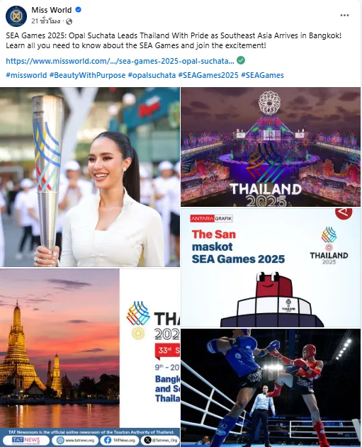 เพจ Miss World สร้างเสียงฮือฮาในโลกโซเชียล หลังออกมาโพสต์ชื่นชม โอปอล–สุชาตา ตัวแทนสาวไทยผู้เปี่ยมเสน่ห์และพลังบนเวทีโลก ที่ล่าสุดได้รับเกียรติใหญ่ในฐานะหนึ่งในผู้ร่วมเปิดพิธีการแข่งขัน ซีเกมส์ ครั้งที่ 33 (SEA Games 2025) ณ ราชมังคลากีฬาสถาน กรุงเทพฯ เมื่อค่ำคืนที่ผ่านมา