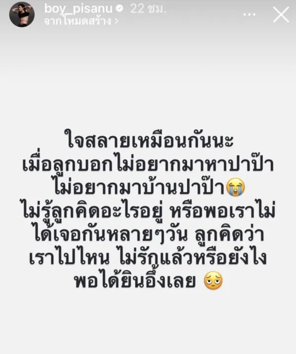 ทำเอาหลายคนอดเป็นห่วงไม่ได้สำหรับ “บอย ภิษณุ” ที่ล่าสุดเจ้าตัวได้โพสต์ไอจีสตอรี่ พร้อมข้อความสุดเศร้าว่า “ใจสลายเหมือนกันนะ เมื่อลูกบอกไม่อยากมาหาปาป๊า ไม่อยากมาบ้านปาป๊า ไม่รู้ลูกคิดอะไรอยู่ หรือพอเราไม่ได้เจอกันหลายๆ วัน ลูกคิดว่าเราไปไหน ไม่รักแล้วหรือยังไง พอได้ยินอึ้งเลย" แน่นอนว่าหลังจากที่เขาได้ยุติความสัมพันธ์กับภรรยาลูกของเขาก็ได้ใช้ชีวิตอยู่กับทางคุณแม่