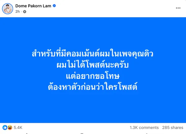 ล่าสุดพระเอกหนุ่มได้ออกมาชี้แจงผ่านเพจส่วนตัวพร้อมทั้งเขียนคำขอโทษโดยมีเนื้อหาว่า "สำหรับที่มีคอมเม้นต์ผมในเพจคุณดิว ผมไม่ได้โพสต์นะครับ แต่อยากขอโทษ ต้องหาตัวก่อนว่าใครโพสต์" ซึ่งก็ทำเอาแฟนๆ ต่างพากันสงสัยต่อว่าสรุปคอมเมนต์แง่ลบอันนั้นเป็นฝีมือใคร หลังจากนี้คงต้องตามต่อว่าพระเอกหนุ่มจะออกมาชี้แจงอะไรต่อ หากมีความคืบหน้าของประเด็นนี้ไม่พลาดนำมาอัปเดตต่ออย่างแน่นอน