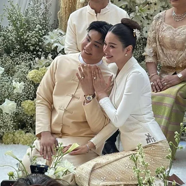 ด้านเจ้าสาว กวาง วรรณปิยะ ปรากฏตัวในลุคชุดไทยล้านนาสุดงดงาม เปล่งออร่าเจ้าสาวแบบจับตา แถมแหวนแต่งงานที่สวมบนนิ้วนางข้างซ้ายก็เปล่งประกายวิบวับ สะท้อนความสุขของชีวิตคู่ได้อย่างลงตัว