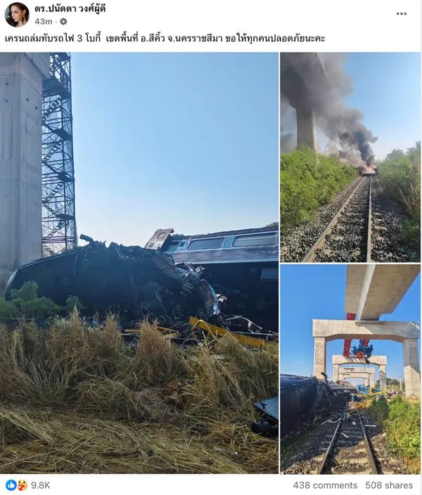 "บุ๋ม ปนัดดา" ส่งกำลังใจ เร่งช่วยเหลือผู้บาดเจ็บ เครนถล่มทับรถไฟ 3 โบกี้ อ.สีคิ้ว จ.นครราชสีมา