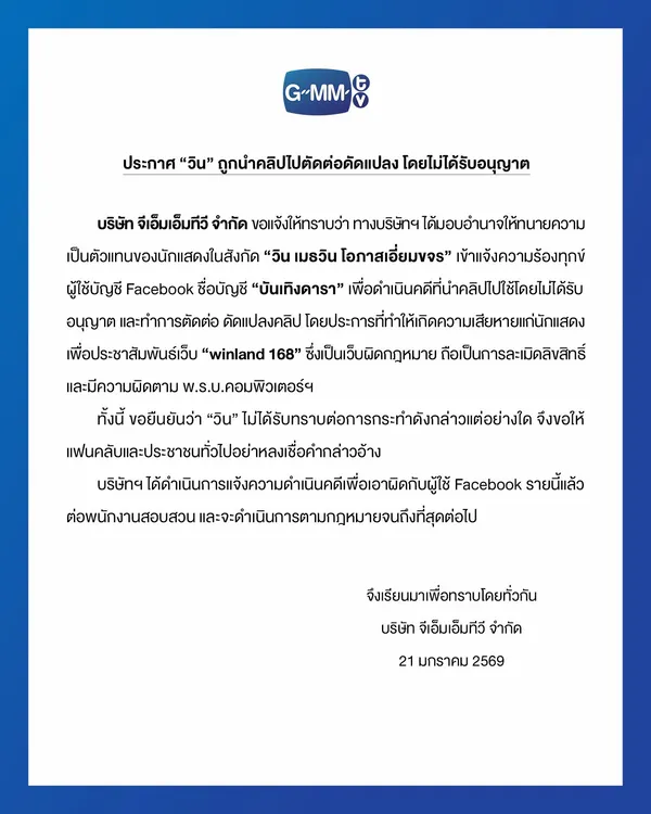 เรียกว่าทางค่ายไม่นิ่งนอนใจสำหรับกรณีที่นักแสดงหนุ่ม "วิน เมธวิน" ที่จู่ๆ ก็ได้มีคลิป AI ปลอมนำภาพและเสียงของเขาไปโปรโมทเว็บพนัน สร้างความเสียหายให้กับนักแสดงหนุ่ม พร้อมทั้งยังทำให้แฟนคลับเกิดความสับสน ซึ่งทางค่ายเองได้ออกมาชี้แจงชัดเจน พร้อมทั้งเตรียมดำเนินคดีกับผู้ที่สร้างคลิปดังกล่าว โดยมีเนื้อหาในจดหมายว่า “ประกาศ "วิน" ถูกนำคลิปไปตัดต่อดัดแปลง โดยไม่ได้รับอนุญาต บริษัท จีเอ็มเอ็มทีวี จำกัด ขอแจ้งให้ทราบว่า ทางบริษัทฯ ได้มอบอำนาจให้ทนายความเป็นตัวแทนของนักแสดงในสังกัด “วิน เมธวิน โอภาสเอี่ยมขจร” เข้าแจ้งความร้องทุกข์ผู้ใช้บัญชี Facebook ชื่อบัญชี “บันเทิงดารา”
