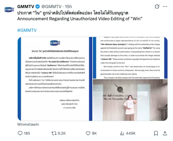 เพื่อดำเนินคดีที่นำคลิปไปไปใช้โดยไม่ได้รับอนุญาต และทำการตัดต่อ ดัดแปลงคลิป โดยประการที่ทำให้เกิดความเสียหายแก่นักแสดง เพื่อประชาสัมพันธ์เว็บ “winland 168” ซึ่งเป็นเว็บผิดกฎหมาย ถือเป็นการละเมิดลิขสิทธิ์และมีความผิดตาม พ.ร.บ.คอมพิวเตอร์ฯ ทั้งนี้ ขอยืนยันว่า “วิน” ไม่ได้รับทราบต่อการกระทำดังกล่าวแต่อย่างใด จึงขอให้แฟนคลับและประชาชนทั่วไปอย่าหลงเชื่อคำกล่าวอ้าง บริษัทฯ ได้ดำเนินการแจ้งความดำเนินคดีเพื่อเอาผิดกับผู้ใช้ Facebook รายนี้แล้วต่อพนักงานสอบสวน และจะดำเนินการตามกฎหมายจนถึงที่สุดต่อไป จึงเรียนมาเพื่อทราบโดยทั่วกัน”