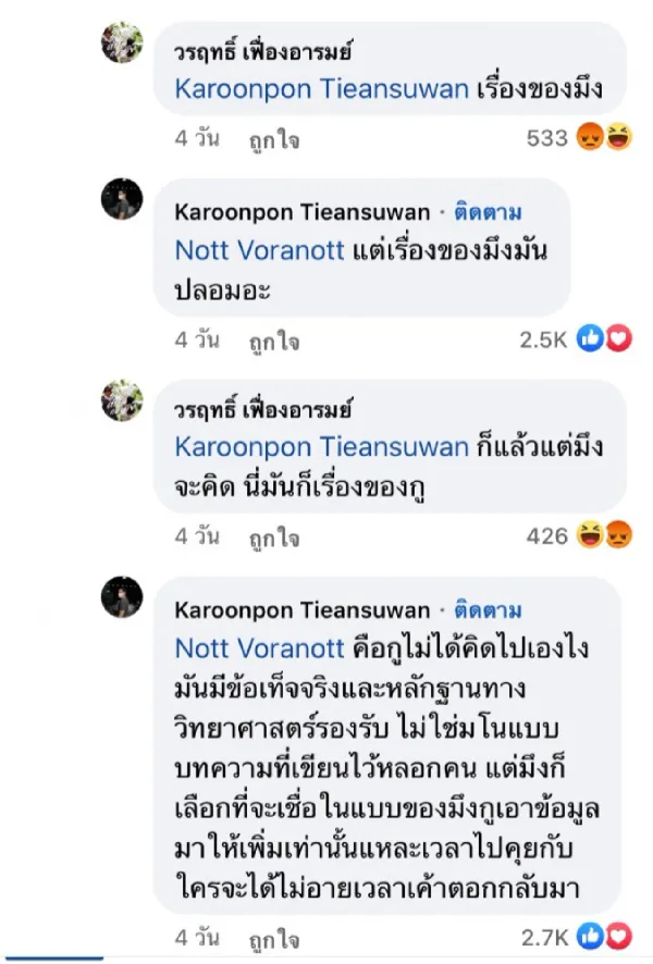 ที่ "น็อต" เองได้โพสต์แชร์บทความลงบนหน้าเพจส่วนตัว ทางด้าน "เพชร" เองได้เข้ามาคอมเมนต์ใต้โพสต์ดังกล่าวว่า “นี่คือสักแต่ว่าเขียน เอาใจรัฐบาลใช่มะ” เกิดเป็นการโต้เถียงกันผ่านคอมเมนต์ที่ค่อยข้างรุนแรง จนท้ายที่สุดแล้ว "น็อต" ได้ปิดจบว่า "ก็แล้วแต่มึงจะคิด นี่มันก็เรื่องของกู"
