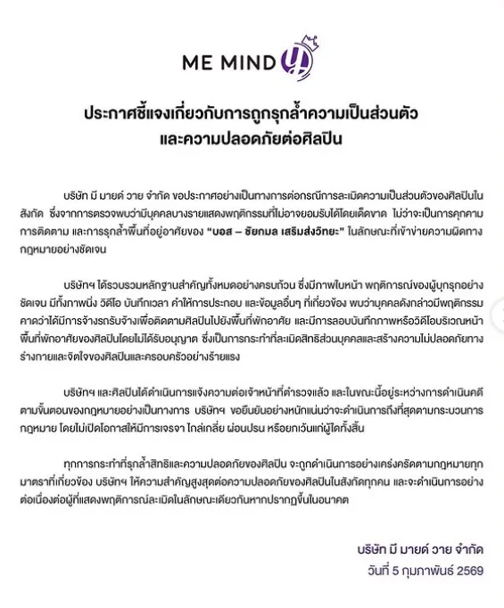 กลายเป็นประเด็นจริงจังด้านความปลอดภัย เมื่อ บอส-ชัยกมล เสริมส่งวิทยะ นักแสดงหนุ่มในสังกัด มี มายด์ วาย ตัดสินใจเข้าแจ้งความกับเจ้าหน้าที่ตำรวจ หลังพบว่ามีบุคคลภายนอกแสดงพฤติกรรมคุกคาม ละเมิดความเป็นส่วนตัว ด้วยการติดตามและลอบบันทึกภาพบริเวณที่พักอาศัยอย่างต่อเนื่อง จนสร้างความกังวลต่อความปลอดภัยของตนเองและครอบครัว