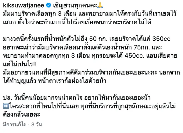 "กิ๊ก สุวัจนี" โพสต์ IG เชิญชวนแฟนๆ บริจาคเลือด ด้านตนเองตั้งใจจริง บริจาคเลือด จนกว่าจะบริจาคไม่ได้