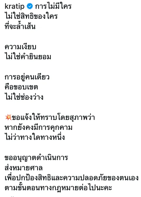 "การไม่มีใคร ไม่ใช่สิทธิของใคร ที่จะล้ำเส้น ความเงียบ ไม่ใช่คำยินยอม การอยู่คนเดียวคือขอบเขตไม่ใช่ช่องว่าง ขอแจ้งให้ทราบโดยสุภาพว่า หากยังคงมีการคุกคามไม่ว่าทางใดทางหนึ่ง ขออนุญาตดำเนินการ ส่งหมายศาลเพื่อปกป้องสิทธิและความปลอดภัยของตนเองตามขั้นตอนทางกฎหมายต่อไปนะคะ" หลังจากที่เธอโพสต์ลงไปก็มีแฟนๆ เข้ามาให้กำลังใจเธอเป็นจำนวนมากและเชื่อว่าหลังจากนี้คงไม่มีใครกล้า DM คุกคามเธออีก