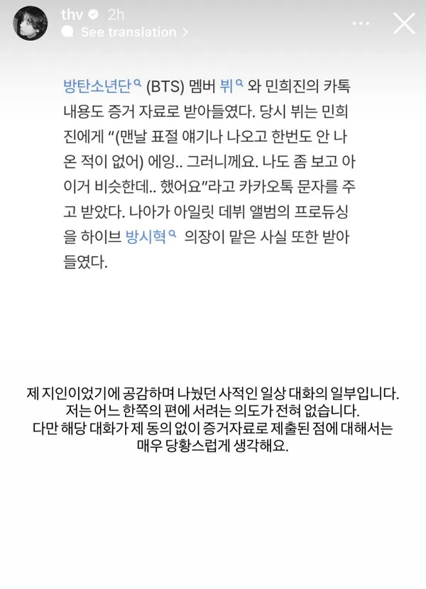 ไม่นานมานี้มีสำนักข่าวเกาหลีได้เปิดเผยว่าคดีระหว่าง HYBE กับ มินฮีจิน ที่ผ่านมานี้ ได้มีการใช้ข้อความแชทของ วี BTS เข้ามาเป็นหลักฐานด้วย