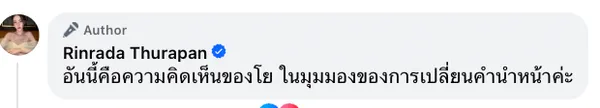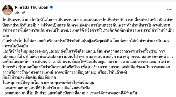 เรียกว่ากำลังเป็นที่สนใจของใครหลายคนสำหรับเรื่องราวของการเปลี่ยนคำนำหน้าชื่อของ Transgender ที่มีหลายคนทั้งสนับสนุน และหลายคนก็คัดค้านการเปลี่ยนคำนำหน้าชื่อ โดยล่าสุด "โยชิ รินรดา" นักแสดงสาวทรานส์ชาวไทย ผู้คว้ามงกุฎ Miss Tiffany's Universe 2017 ได้ออกมาให้ความเห็นกับประเด็นนี้ผ่านทางเพจส่วนตัวของเธอ โดยเธอระบุว่า "โยเป็นทรานส์ และโยก็ภูมิใจในการเป็นทรานส์ค่ะ และแน่นอนว่าโยเห็นด้วยกับการเปลี่ยนคำนำหน้า เนื่องด้วยปัญหาส่วนตัวที่เคยมีมา ไม่ว่าจะเป็นการเดินทางไปตปท การโดนตรวจค้นเพราะคำนำหน้าเราไม่ตรงกับเพศสภาพ การที่ไม่สามารถเดินทางไปในบางประเทศได้ หรือการหัวเราะคิกคักต่อหน้าเราเพระเรามีคำนำหน้าเป็นนาย