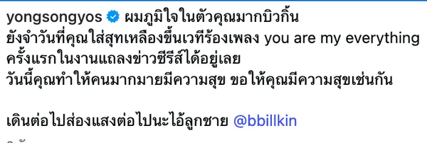 "ย้ง ทรงยศ" โพสต์อินสตาแกรมเผยความในใจถึง "บิวกิ้น พุฒิพงศ์" หลังจบคอนเสิร์ตใหญ่ “BILLKIN FEELQUENCY CONCERT