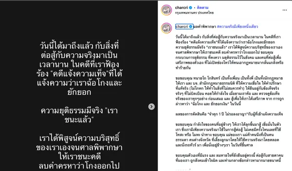 วันนี้ได้มาถึงแล้ว กับสิ่งที่ต่อสู้กับความจริงมาเป็นเวลานาน ในคดีที่เราฟ้องร้อง “คดีแจ้งความเท็จ”ที่ได้แจ้งความว่าเราฉ้อโกงและยักยอก ความยุติธรรมมีจริง ”เราชนะแล้ว“ เราได้พิสูจน์ความบริสุทธิ์ของเราเองจนศาลพิพากษาให้เราชนะคดี ลบคำครหาว่าโกงออกไป ขอบคุณกระบวนการยุติธรรม ที่คงควา มยุติธรรมไว้ในสังคม และคนที่ต่อสู้เพื่อเสรีภาพของตัวเอง ที่ไม่เปิดช่องโหว่ให้คนเอากฏหมายมากลั่นแกล้งหรือทำร้ายกัน