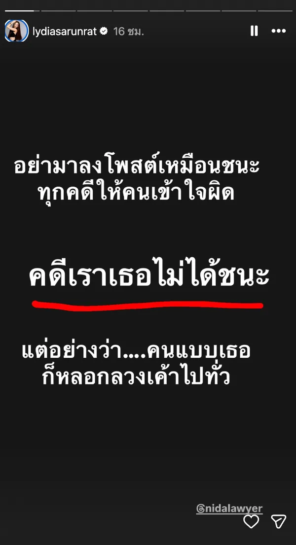 ทางด้าน "ลิเดีย" เองได้โพสต์ข้อความในสตอรี่ส่วนตัว โดยเขียนว่า "อย่ามาลงโพสต์เหมือนชนะทุกคดีให้คนเข้าใจผิด คดีเราเธอไม่ได้ชนะ แต่อย่างว่า... คนแบบเธอก็หลอกลวงเค้าไปทั่ว"
