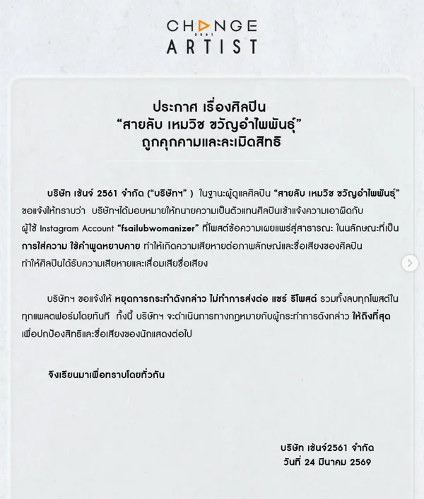 เรียกว่าทำเอาแฟนคลับได้เฮ หลังจากที่มีการหมิ่นประมาทศิลปินอย่างหนุ่ม "สายลับ เหมวิช" ซึ่งแน่นอนว่าทางค่ายเองไม่ยอมปล่อย ได้ออกจดหมาย พร้อมทั้งแจ้งความเอาผิดกับผู้กระทำความผิด โดยระบุในจดหมายว่า "บริษัท เช้นจ์ 2561 จำกัด (“บริษัทฯ”) ในฐานะผู้ดูแลศิลปิน “สายลับ เหมวิช ขวัญอำไพพันธุ์” ขอแจ้งให้ทราบว่า บริษัทฯได้มอบหมายให้ทนายความเป็นตัวแทนศิลปินเข้าแจ้งความเอาผิดกับผู้ใช้ Instagram Account "fsailubwomanizer" ที่โพสต์ข้อความเผยแพร่สู่สาธารณะ ในลักษณะที่เป็นการใส่ความ ใช้คำพูดหยาบคาย ทำ ให้เกิดความเสียหายต่อภาพลักษณ์และชื่อเสียงของศิลปิน ทำให้ศิลปินได้รับความเสียหายและเสื่อมเสียชื่อเสียง