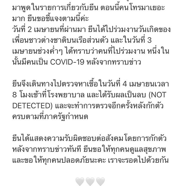 โดย ยีนส์ โพสต์ว่า จากที่ พี่ หนุ่ม กรรชัย พูดในรายการเกี่ยวกับ ยีน เธอขอชี้แจงว่าไปร่วมงานปาร์ตี้เพื่อนต่างชาติบนเรือในวันที่ 2 เมษายน ทราบข่าวผู้ติดเชื้อวันที่ 3 เมษายน และเดินทางไปตรวจหาเชื้อทันทีในวันที่ 4 เมษายนตอน 8 โมงเช้า และผลออกมาเป็นลบและจะทำการตรวจอีกครั้งเมื่อกักตัวครบ